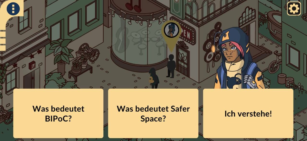 Während sich Spieler*innen durch die Stadt bewegen, werden Gespräche geführt und kleine Aufgaben gelöst. Schnell wird klar, dass das eingeführte Bewertungssystem nicht nur die Toleranz und den Respekt fördert, sondern auch Fragen und Herausforderungen hervorbringt. Das Spiel lädt dazu ein, die Logik hinter dem Score zu hinterfragen und mögliche Ungerechtigkeiten zu erkennen und zu lernen, wie Bewertung, Teilhabe und Miteinander funktionieren und welche Konsequenzen daraus entstehen können. Es kann jedoch nur zwischen vorgegebenen Handlungs- oder Antwortmöglichkeiten ausgewählt werden.